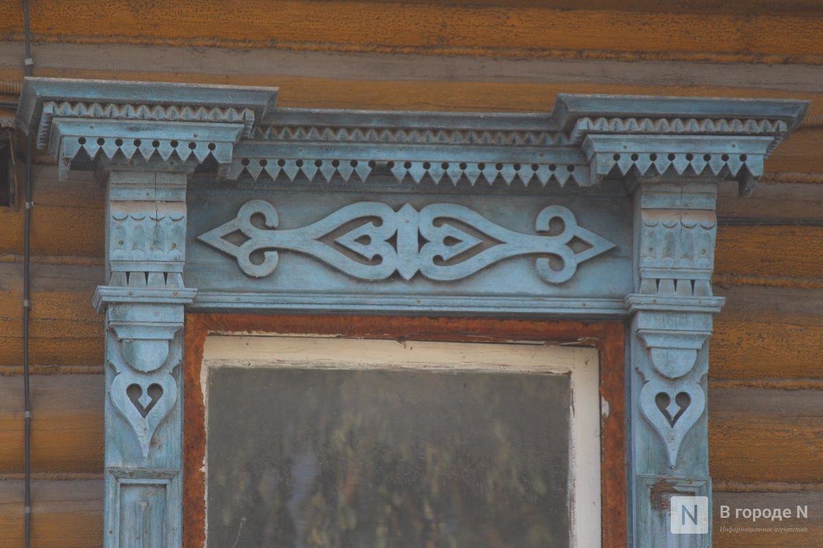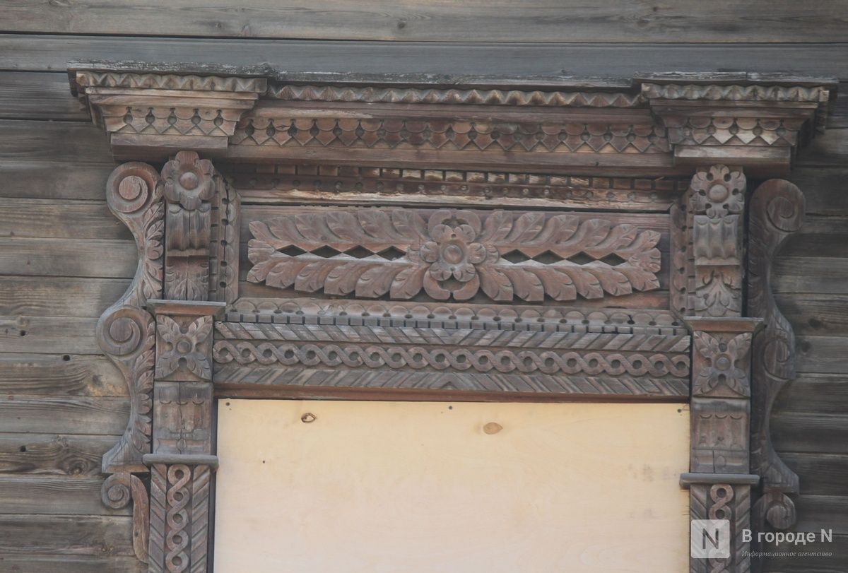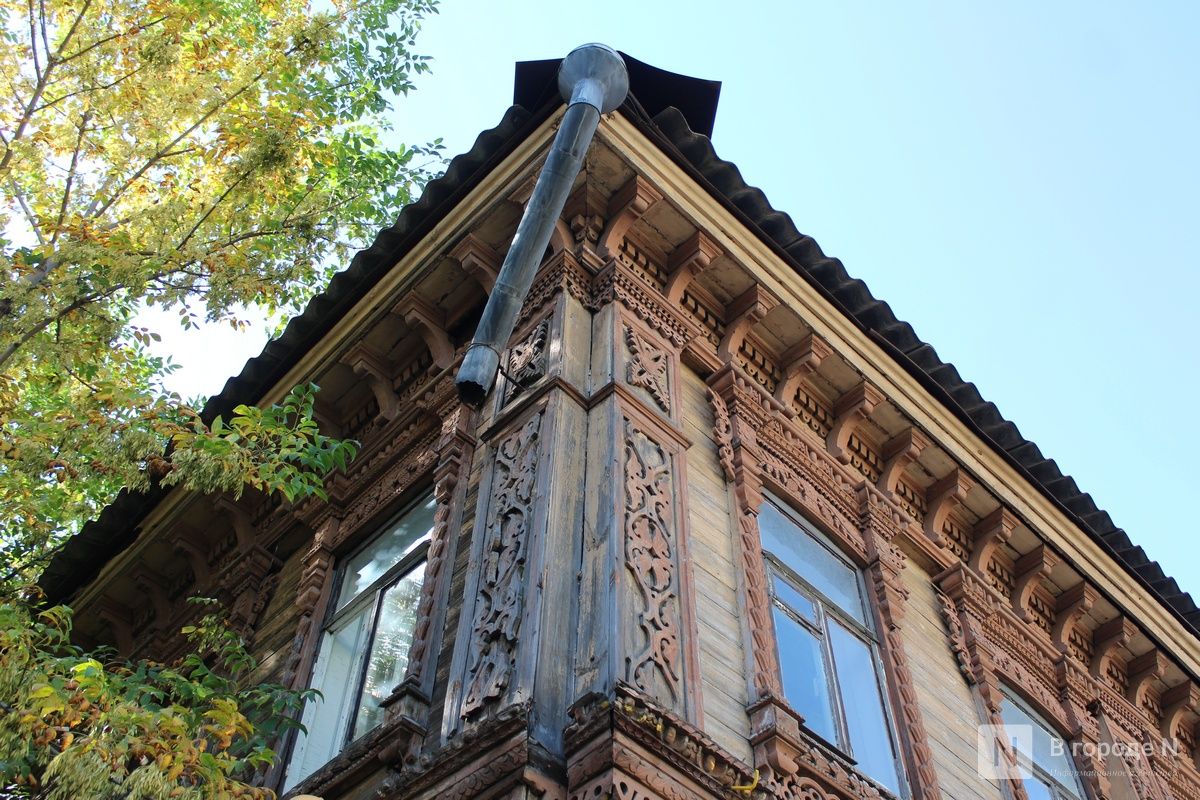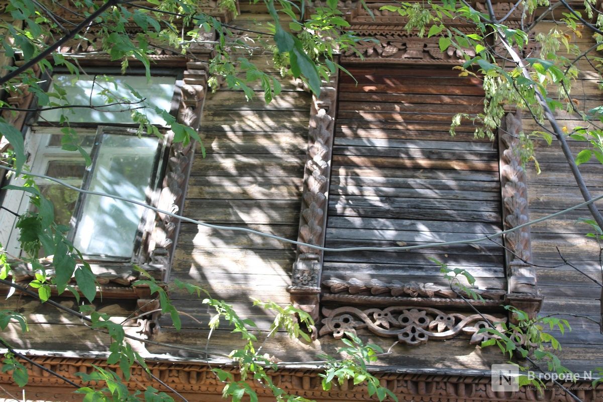 В самом Грузинском квартале есть и новые здания, но нас интересовали именно старинные дома. Сейчас они расселены и ждут реставрации. Первыми на пути попадаются дома № 13 и 11, образующие единый комплекс — выявленный памятник градостроительства и архитектуры. Фасад первой постройки украшен резными деревянными элементами с различными орнаментами, которые можно долго рассматривать. В узорах в основном тоже главенствует растительная тематика.