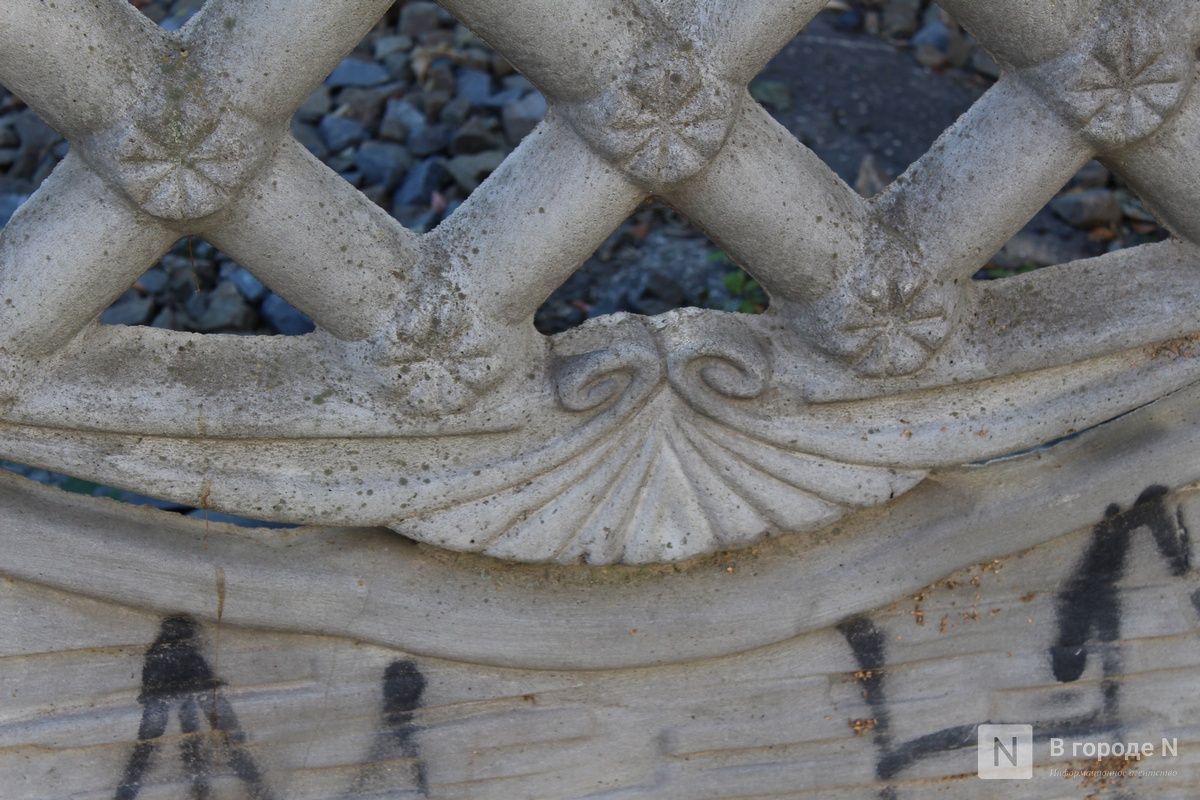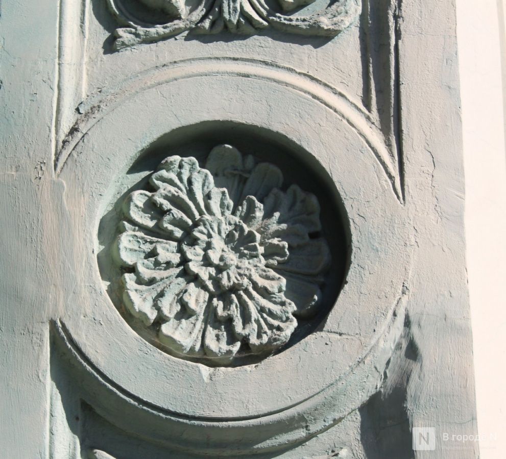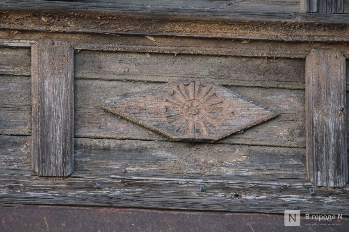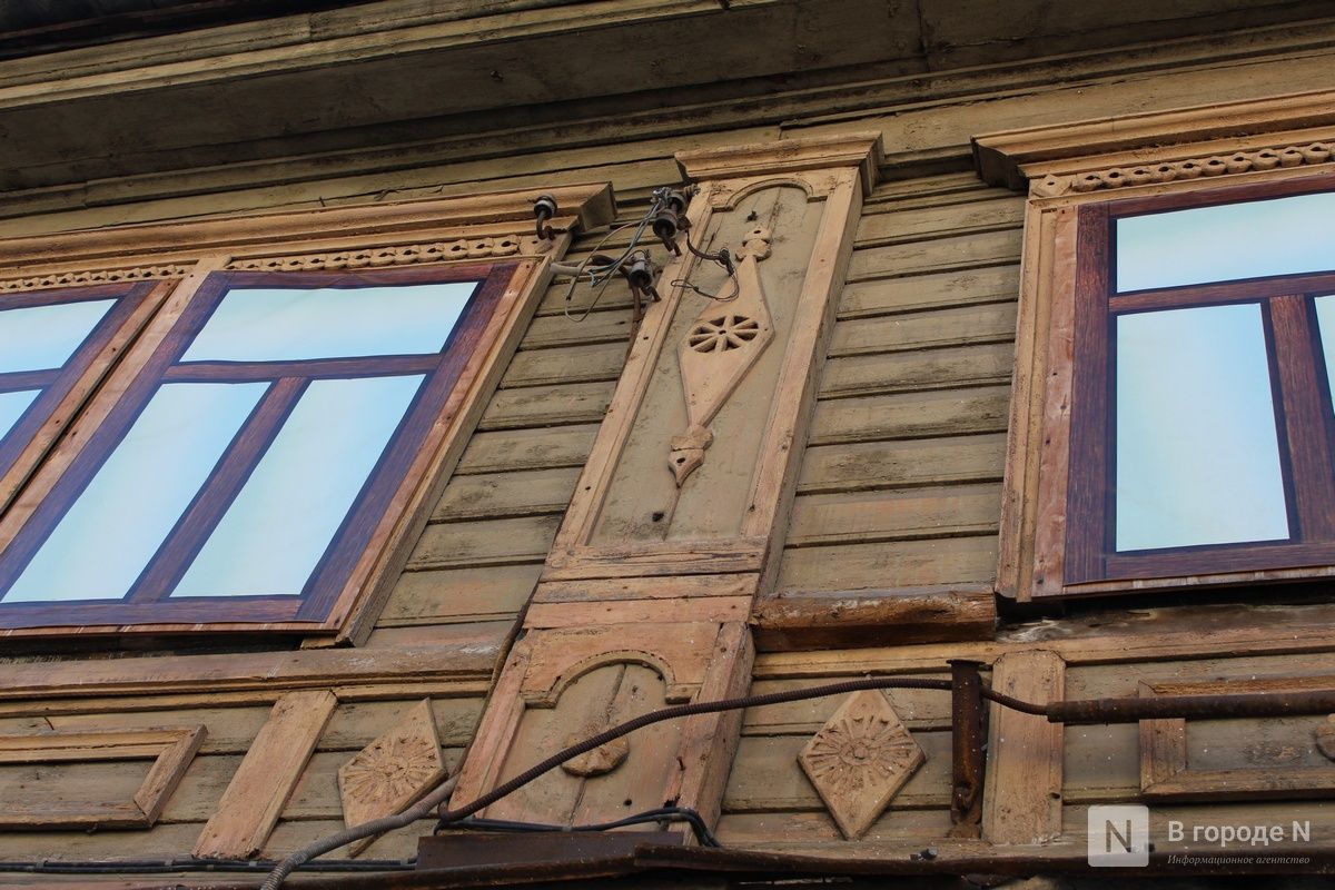 В самом Грузинском квартале есть и новые здания, но нас интересовали именно старинные дома. Сейчас они расселены и ждут реставрации. Первыми на пути попадаются дома № 13 и 11, образующие единый комплекс — выявленный памятник градостроительства и архитектуры. Фасад первой постройки украшен резными деревянными элементами с различными орнаментами, которые можно долго рассматривать. В узорах в основном тоже главенствует растительная тематика.
