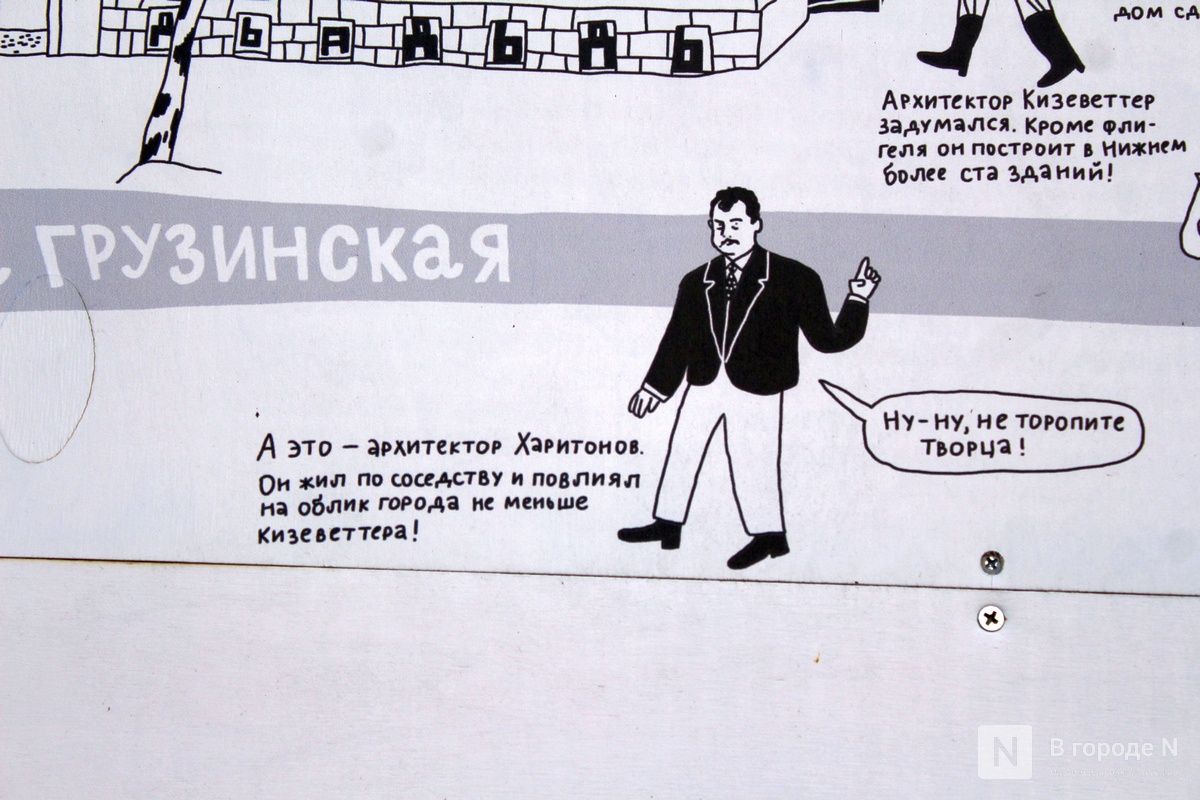 На доме № 11 можно увидеть карту, созданную художницей Катей Гущиной. Она же нарисовала и схему квартала Церкви Трех святителей. В свойственной ей манере автор изобразила все исторические дома улицы Грузинской и ее самых известных жителей.