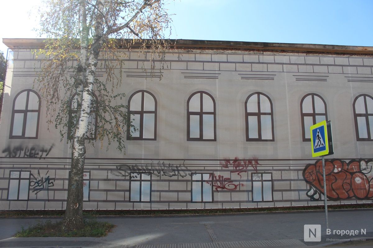 Следующее здание — дом № 9 — сейчас закрыто фальшфасадом. Это усадьба Николая Тарасова. Главный дом был построен в середине XIX века, а красный кирпичный флигель — в 1905 году. Усадьба сменила нескольких владельцев, прежде чем перешла в собственность супругов Тарасовых. А в 2022 году там произошел крупный пожар, и сейчас здание скрыли от посторонних глаз. Но рядом сохранился фрагмент оригинального ограждения.