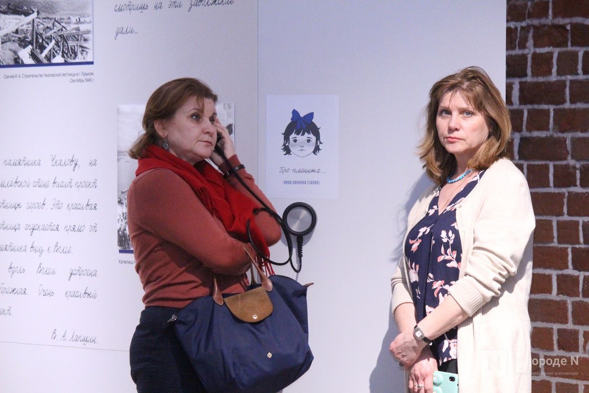 В частности, в ходе работы над выставкой были использованы записи преподавателя Горьковского государственного университета Эдды Телегиной. Когда началась война, ей было 12 лет. Цитаты из дневников Телегиной зачитала ее дочь Мария Лаганина.