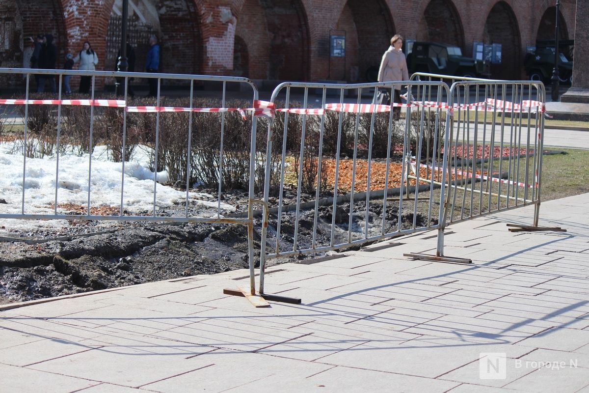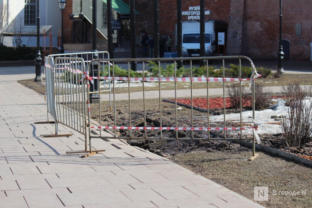Более или менее благополучно пережил зиму и Нижегородский кремль. Раньше там постоянно наблюдались проблемы с брусчаткой, лестницы после зимы тоже требовалось ремонтировать. Сейчас и покрытие, и ступени в хорошем состоянии. Только на одной из клумб на аллее с военной техникой образовался провал грунта. Опасное место огородили сигнальной лентой.