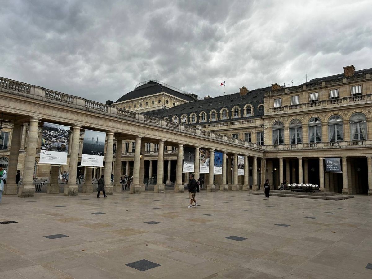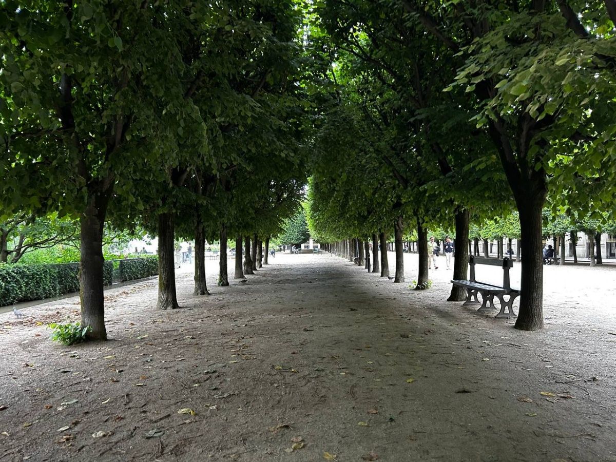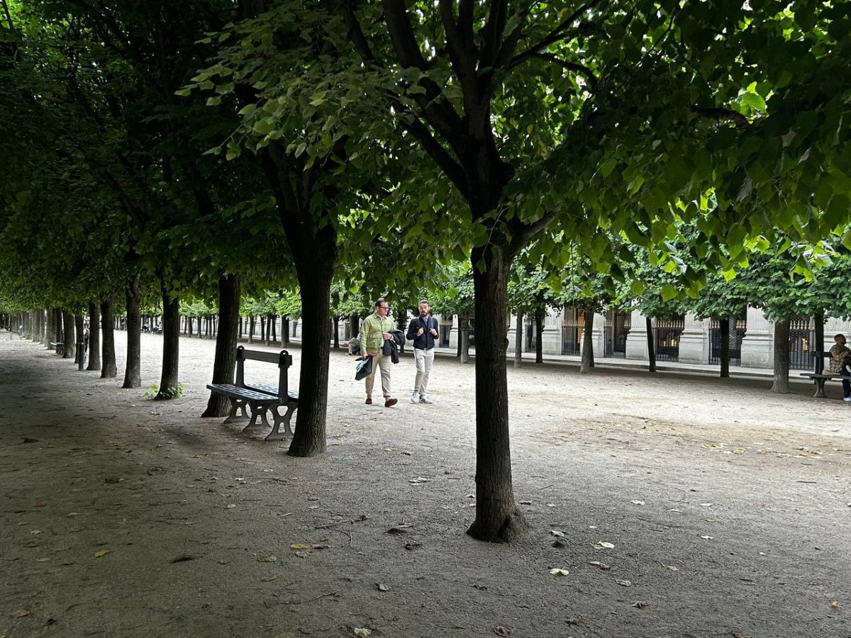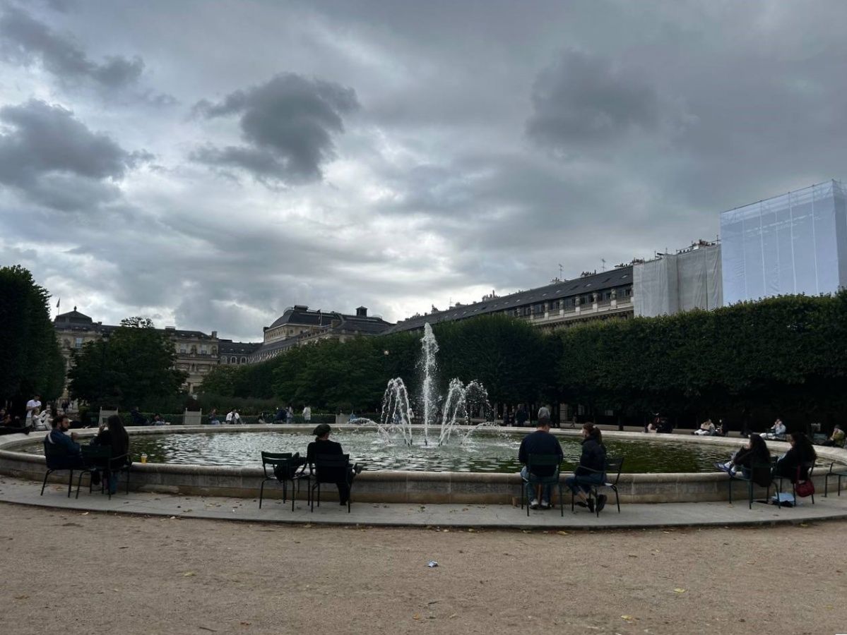 Первый на маршруте — дворец Пале-Рояль, парк и площадь рядом с ним. Аккуратно, по четкой линии высаженные деревья, лавочки в укромных местах у живой изгороди: идеальное место, чтобы спрятаться. Посреди площади — фонтан. Вокруг — зеленые стулья, которые почти всегда заняты.