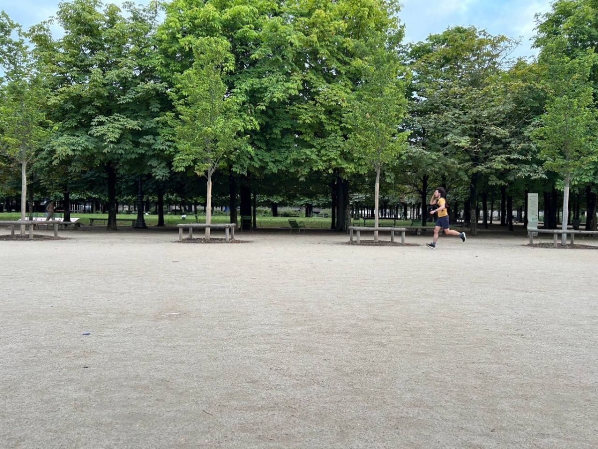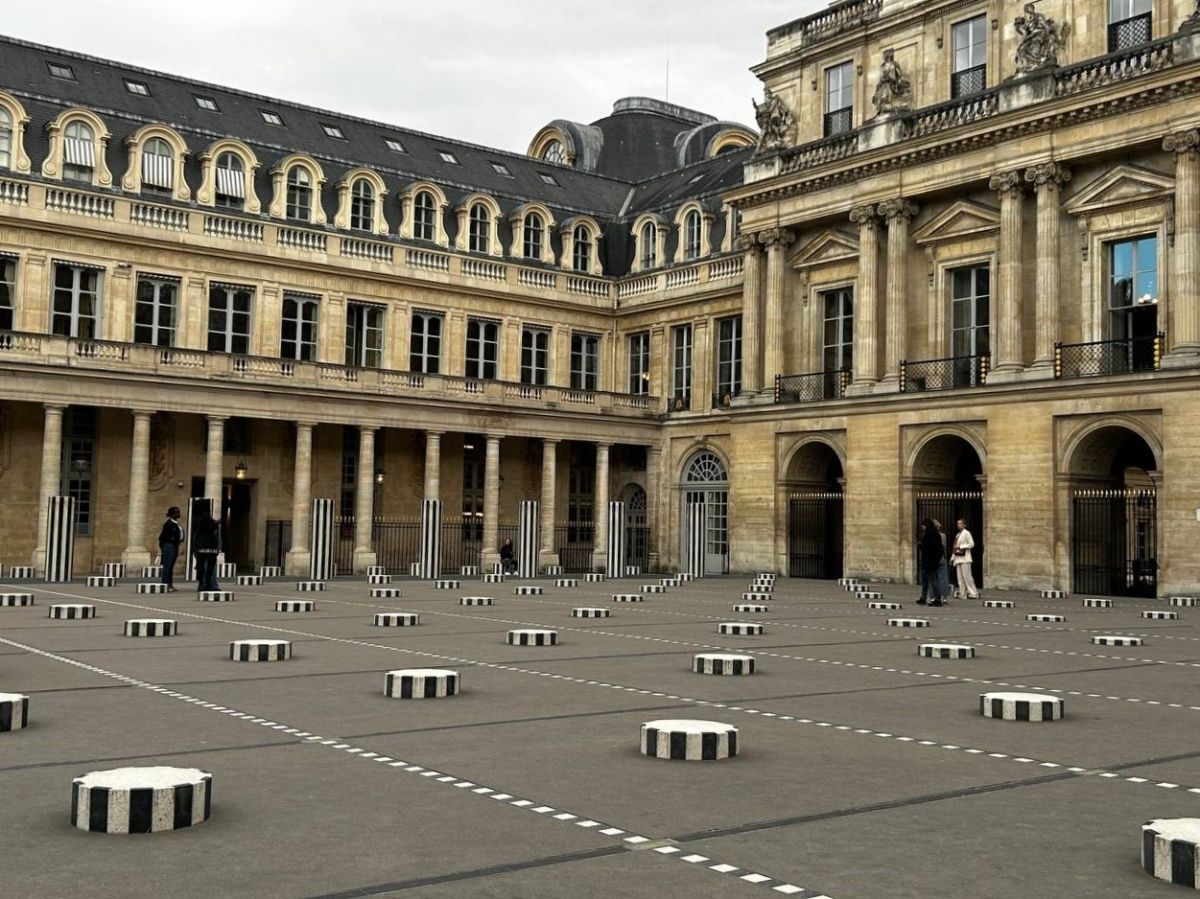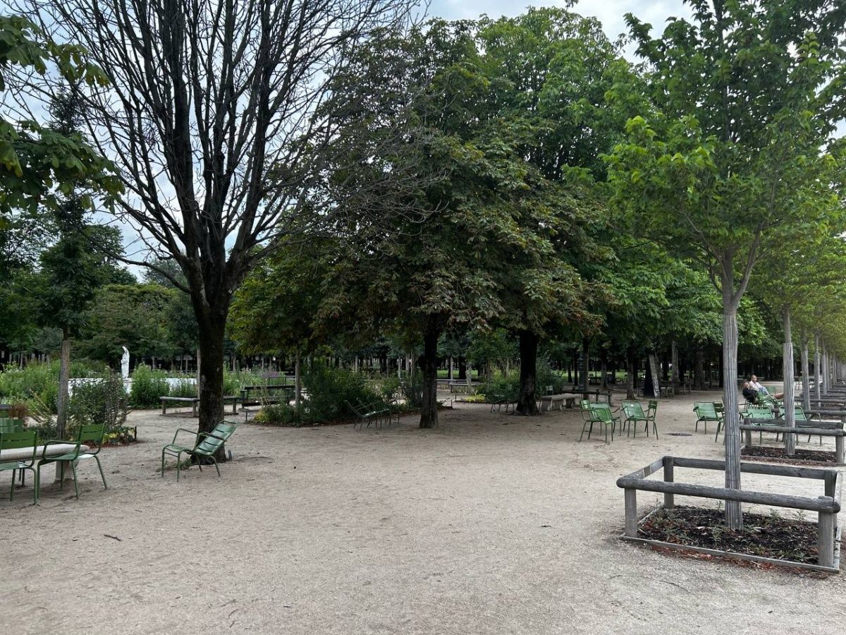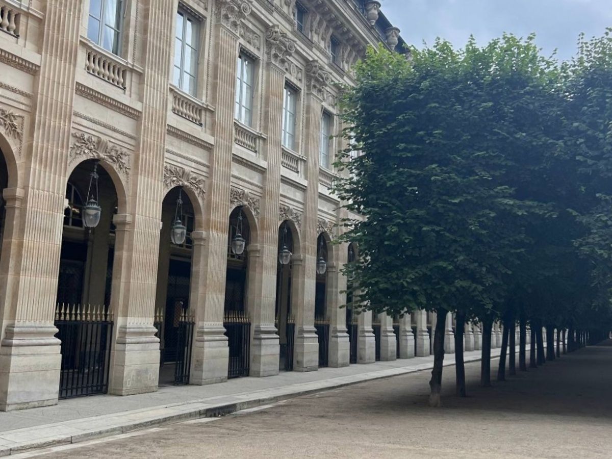 Первый на маршруте — дворец Пале-Рояль, парк и площадь рядом с ним. Аккуратно, по четкой линии высаженные деревья, лавочки в укромных местах у живой изгороди: идеальное место, чтобы спрятаться. Посреди площади — фонтан. Вокруг — зеленые стулья, которые почти всегда заняты.