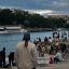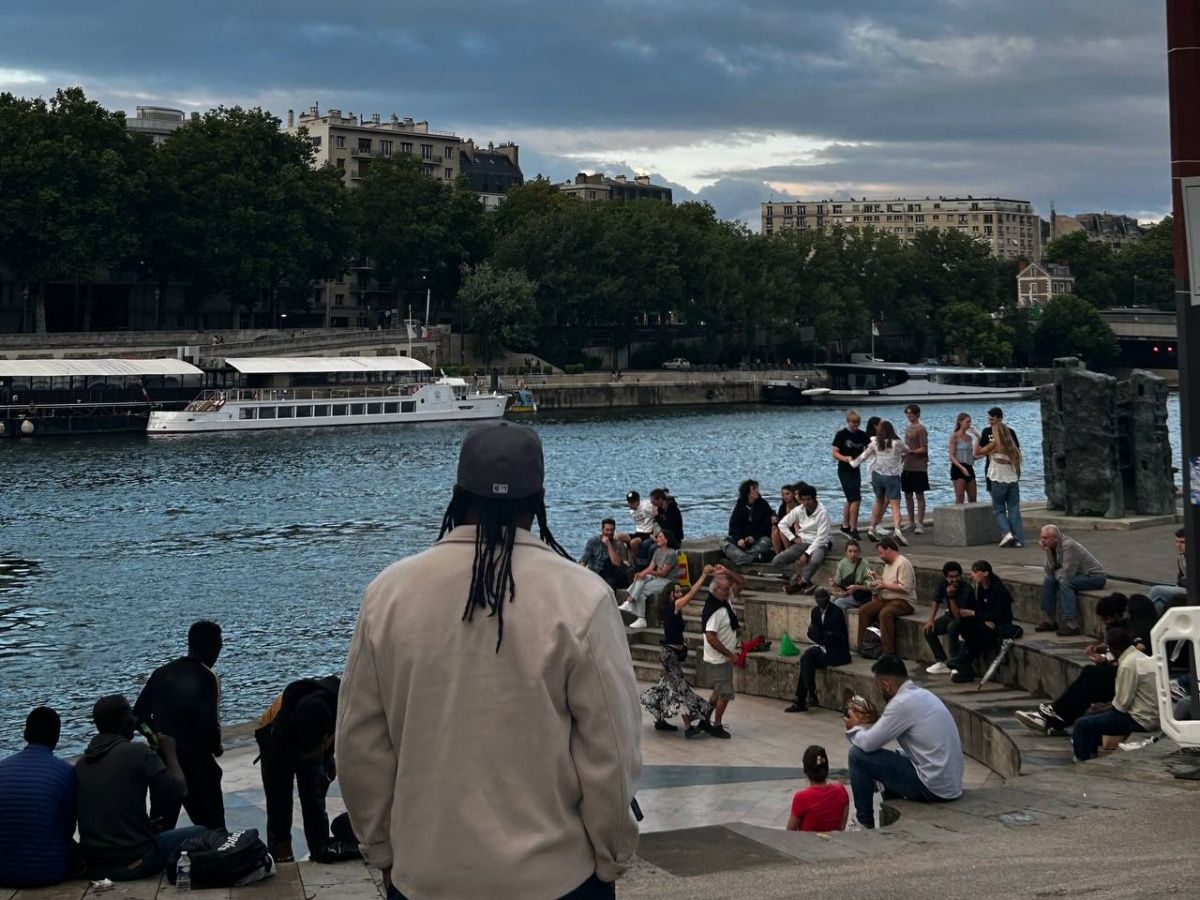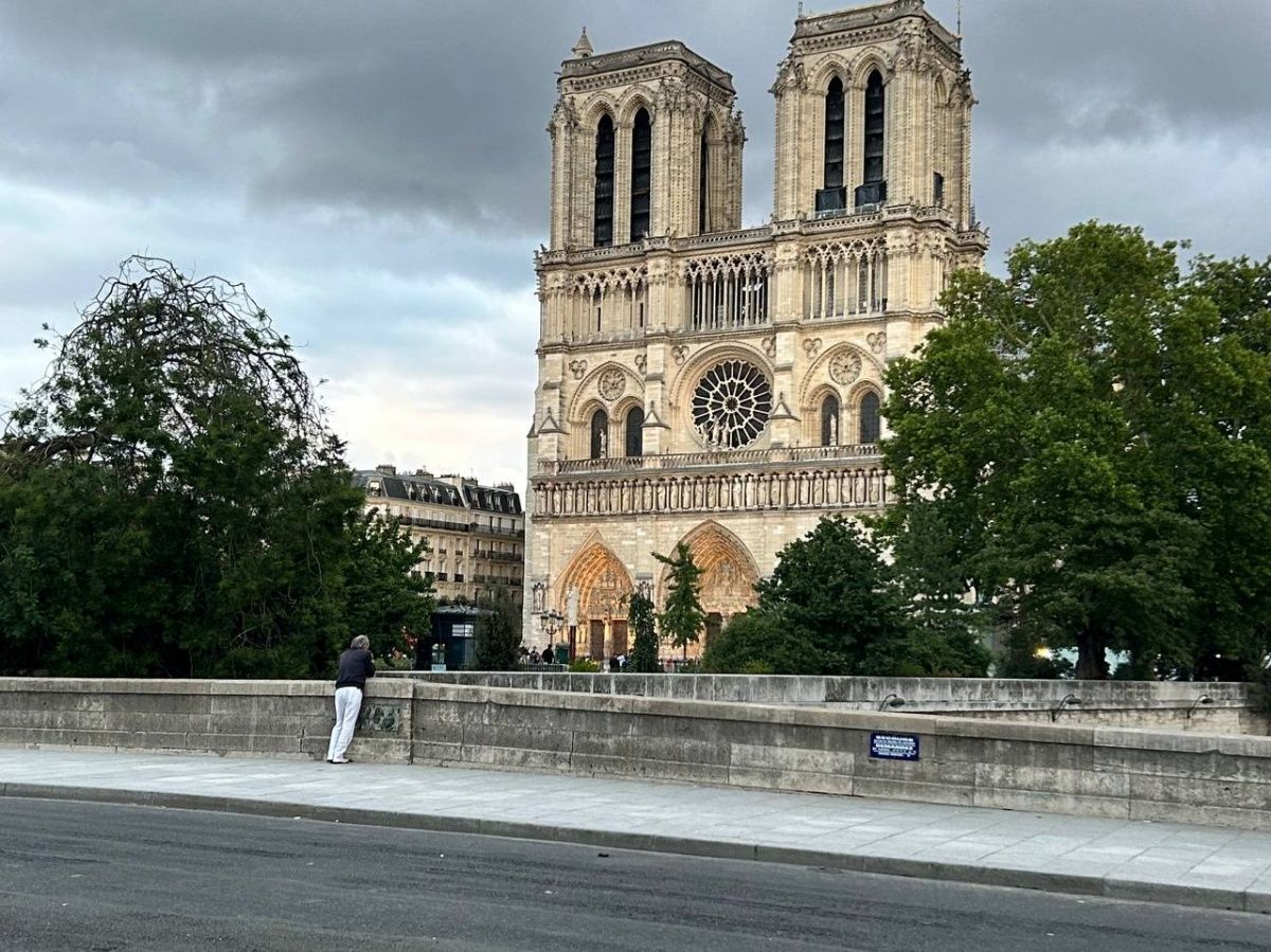 Дошли до набережной Сены, где местные жители собираются каждый день: танцуют, сидят, свесив ноги к воде или прогуливаются на свиданиях. Первым нам показался величественный Нотр-Дам-де-Пари.